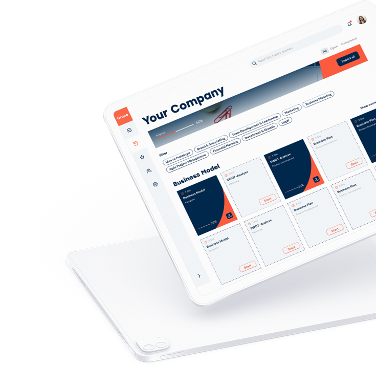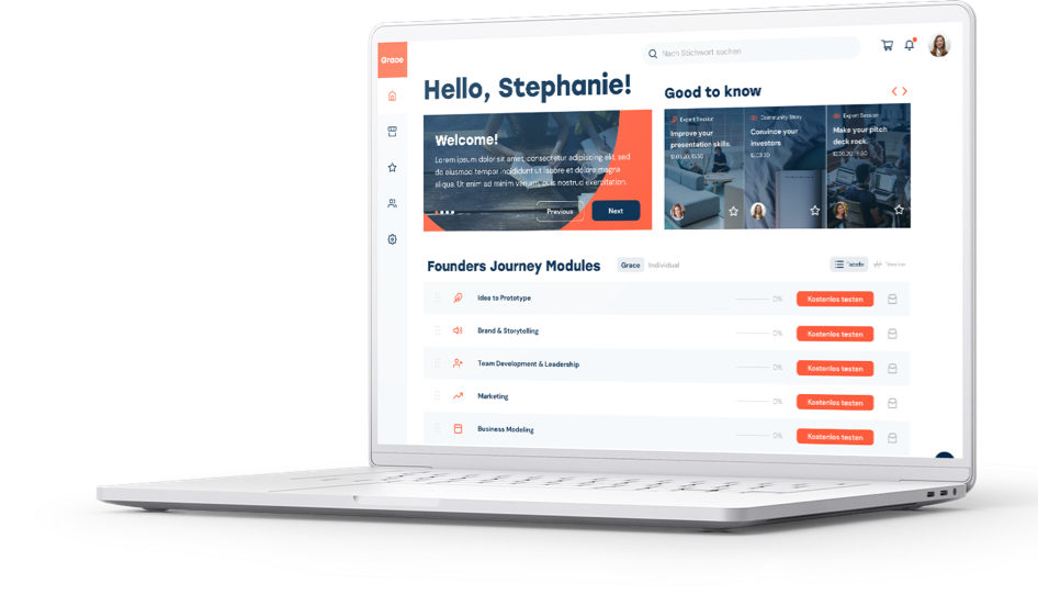 Bei Grace Digital erwartet dich eine Founder's Journey mit insgesamt 8 gründungsrelevanten Themenmodulen, die dich von der Idee zum Prototypen über Marketing und Sales zu wichtigen Investment-, Finanz-, und Legal-Themen führen – stetig kommen neue Themenmodule hinzu! Außerdem hast du die Möglichkeit, dich für peer-to-peer Learning mit anderen Gründerinnen zu vernetzen, sowie Mentoring und Expert*innen-Coaching zu nutzen.
